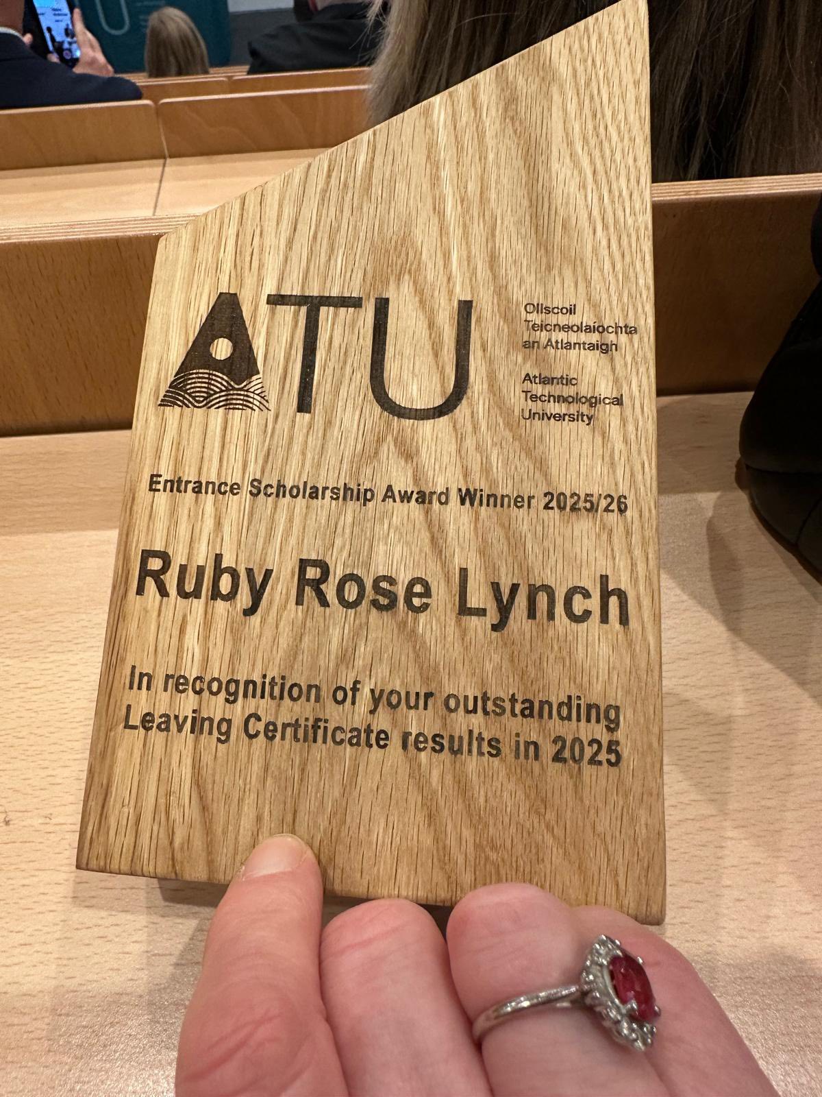 Entrance Scholarship ATU Congratulations to Class of 2025 student Ruby Rose Lynch who was awarded Entrance Scholarship for ATU on the basis of her fantastic Leaving Cert results. Congratulations on this outstanding achievement ! Facebook WhatsApp Viber Twitter